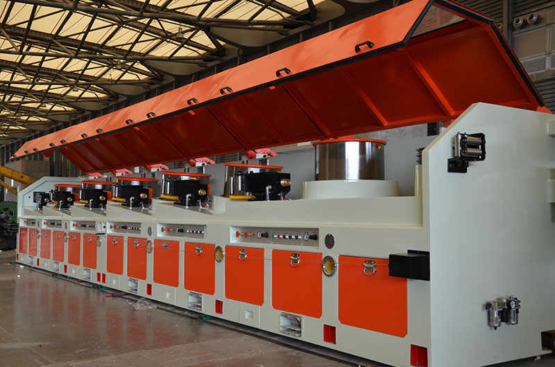 Straight line wire drawing machine designed and produced by Pingsheng has international advanced technical index and performance. Machines adopt many inventive patents and utility model patents in hardening and cooling technology for capstans. Machines are equipped with speed and stress sensors, which can achieve multi-item signal sampling to expand the function of intelligent detection of wire drawing machine. Straight line wire drawing can realize modern production line with the features of high total reduction rate, multi pass, low part reduction and high speed. The capstan diameter of this series of wire drawing machine is Φ350mm-Φ1200mm, the maximum inlet wire diameter is Φ16mm and the minimum wire diameter is Φ0.6mm. The straight line wire drawing machine includes many inventive patents and utility model patents, such as medium capstan cooling structure, die box tuning device, lubrication supply device, pressing wire and pressing wheel device, outlet wire straightening device, etc, which can guarantee easy and stable operation of wire drawing machine.